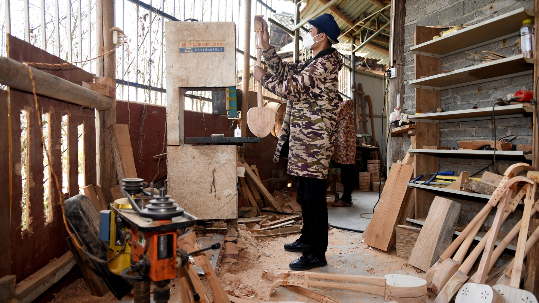 “制作侗族琵琶,木料选用当地的梓木或者香椿木作为侗族琵琶的共鸣箱、琴杆、琴头,使用的木料必须得3年自然风干,做出来的琵琶才不会变形变音色,先按照尺寸画出琵琶轮廓,将其多余的边角料锯出去,用斧头手工修出琴杆的半弧形,再用刮刨细修。凿子凿出共鸣箱的大概深度和宽度,精确量好尺寸,再用凿子慢慢的精修,琵琶的共鸣箱边留厚度为8毫米,盆底厚度为1厘米,尺寸精确误差不能高于0.1毫米为最佳。”陆东辉一边打磨琵琶一边介绍说。