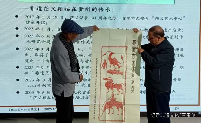 展品内容丰富多元,既有北京海淀老龄大学带来的《汉画像上的中国故事》《颐和园露陈石座颖拓艺术》等展现古都风韵的作品,也有贵州茫父书画院创作的《秦·泰山残石》《贵州龙(生活在三叠纪的贵州居民)》《水书颖拓》等富含地域特色的佳作,充分体现了京黔两地颖拓艺术交流互鉴的丰硕成果与良好氛围。