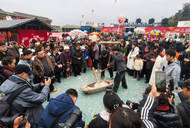 逛集市、购年货、赏非遗、品美食。在打糍粑环节,吸引了众多游客参与体验,大家轮流上阵,一锤一锤敲打着粑槽里的糯米,并争相品尝了新鲜出炉、热气腾腾的糍粑,分享着喜悦。
