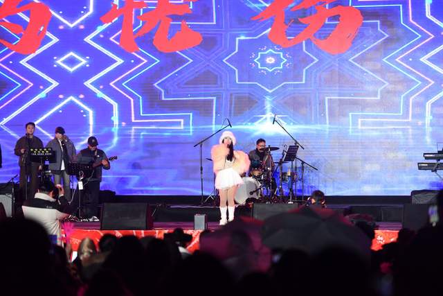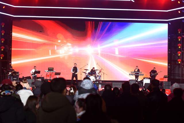 晚19时30分,演出在主持人热情洋溢的新春祝福中拉开帷幕。当聚光灯骤然亮起,新世纪乐团以极具爆发力的现场演奏率先登场。《一起摇摆》的激昂鼓点如春雷滚过广场,瞬间点燃全场;《霓虹甜心》的轻快旋律与观众手中的荧光棒交相辉映,将人民广场化作一片流动的光海。随后的《淋雨一直走》《稻香》《不该》《你把我灌醉》六首曲目接连上演,电吉他的锐利、贝斯的厚重与键盘的悠扬在夜空中碰撞,既有时尚都市的活力奔涌,亦有温暖治愈的人间烟火。舞台下,年轻观众随节拍挥手哼唱,年长者亦含笑驻足,现代音乐的普适魅力在此刻跨越年龄,凝聚成凉都新春第一抹热烈的底色。