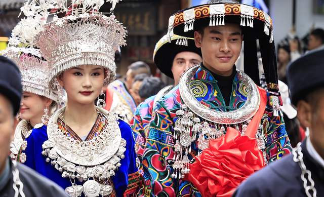 13时许,吉时已到。苗寨小北门骤然沸腾,锣鼓喧天,芦笙悠扬。身着玄色亮布衣衫的苗族小伙们吹响芒筒,浩浩荡荡的迎亲队伍在此集结。在涌动的人潮中,两张异国面孔格外引人注目——一位来自澳大利亚的男士与他的俄罗斯女友,身着精心准备的盛装,与本土情侣并肩而立。他们眼中闪烁着好奇与期待,即将在这场东方最古老的婚俗仪式里,扮演一日主角。