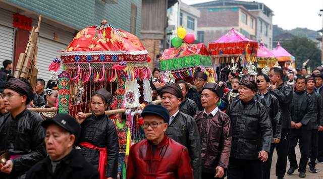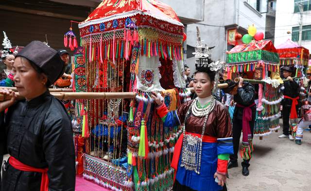 晌午时分,阳光透过云层洒向宰门村的吊脚楼,整个寨子早已人声鼎沸。寨门口,由寨中兄弟和晚辈组成的迎亲队伍吹响了清脆嘹亮的芦笙,敲响了震天动地的锣鼓。红地毯从村口一直铺向寨子深处,仿佛一条指引归家的红飘带。