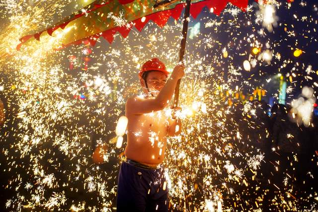 火光辉映下,舞龙者们古铜色的肌肤闪闪发亮,他们毫无惧色,反而愈战愈勇。祥龙在他们手中,时而盘旋穿梭,时而腾跃翻转,在密集的火雨中尽情狂舞。火花落在他们身上,溅起点点亮光,仿佛是勇气的勋章。一条龙被喷洒得越“花”,便说明它越受欢迎,舞龙者们脸上的神情也愈发自豪与激昂。那是一种被认可、被祝福的荣耀,是与神龙共舞、与天地同欢的极致畅快。