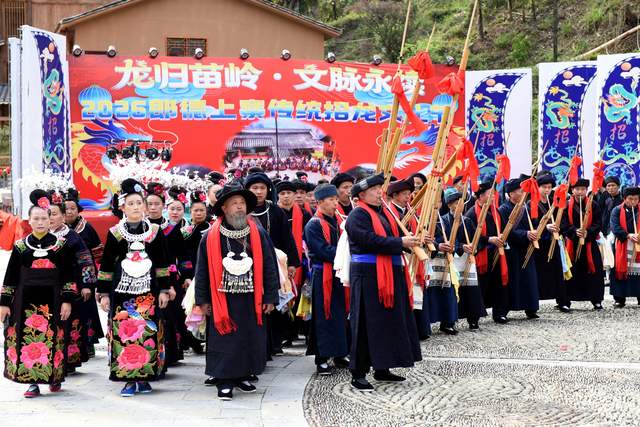 “鼓藏节”是苗族最隆重、最古老的祭祀大典,而“招龙节”作为其起始仪式,承载着苗家人敬祖祈福、期盼寨兴人旺的千年信仰。这一习俗源于苗族先民对自然的崇拜,一般在农历二月万物复苏之际举行,属省级非物质文化遗产,每十三年举行一次,连续举办三年。2026年,恰逢郎德苗寨鼓藏节开篇元年,招龙节的举行,寓意迎龙纳福、开启新岁吉祥,具有格外厚重的文化意义。