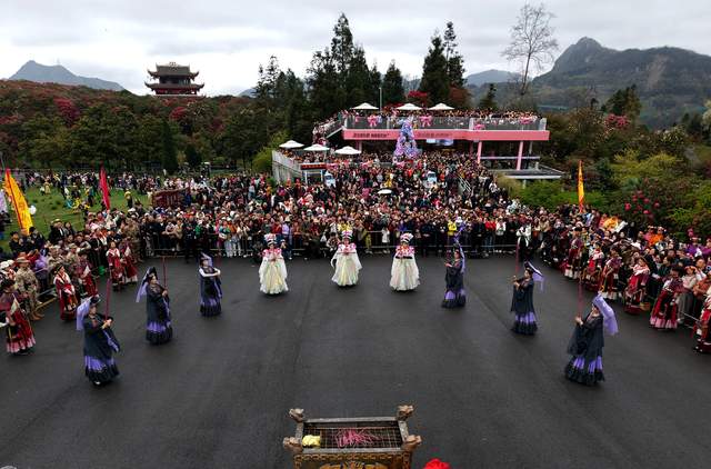 中国记录通讯社(记者:王玉伦 黄庆松 通讯员:段彪)贵州消息:三月春风拂过乌蒙山麓,百里杜鹃金坡景区百花坪上,漫山遍野的杜鹃花正次第绽放,如霞似锦。3月28日上午10时,一年一度的“祭花神”非遗展示如约而至,以“锦心祈福·索玛庇佑”为主题,一场古朴庄重的彝族文化盛宴在这片花的海洋中拉开帷幕,让八方游客沉浸式领略非遗魅力,共赴一场春日花海的浪漫之约。