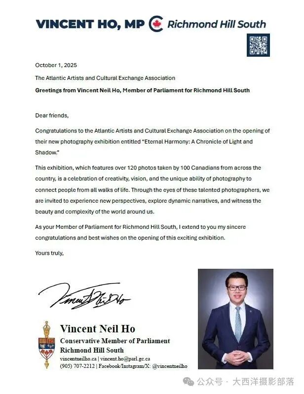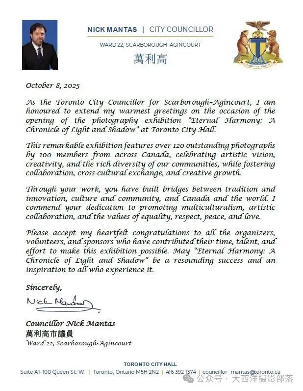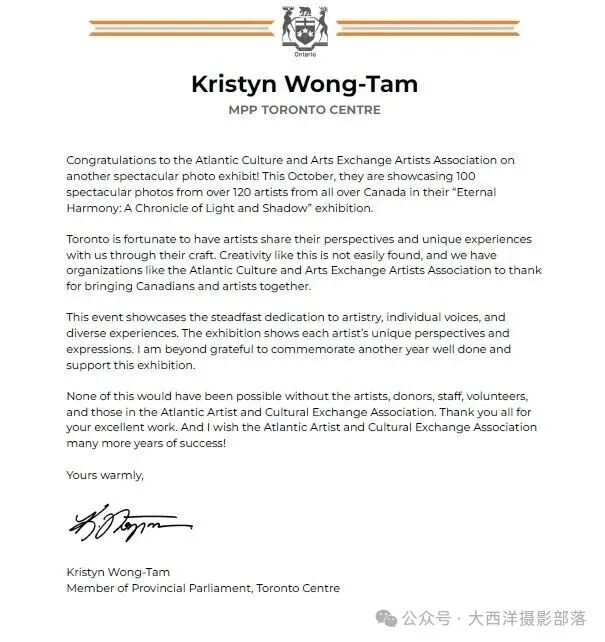 来自波士顿华人摄影协会(BCPA)会长石见(Ann Fong)的中英文贺信带来了跨国友谊的温度:“ 我曾在多伦多生活十年,这座城市承载着我对艺术的记忆 。 看到如此高水平的摄影展在这里举行,倍感欣喜与亲切 。”