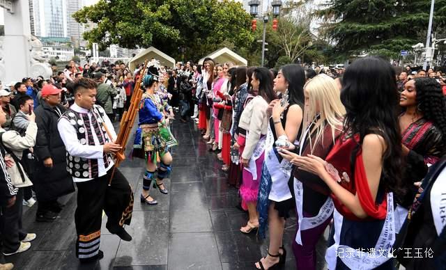 佳丽们在甲秀楼景区观看芦笙舞表演