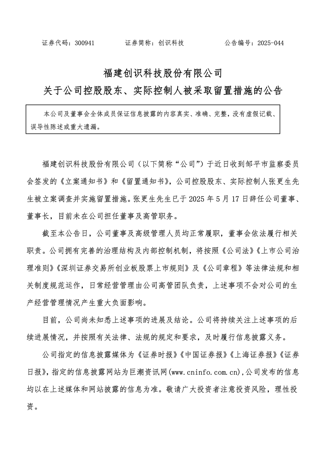 2025 年 12 月 22 日,福建创识科技股份有限公司发布《控股股东、实际控制人被采取留置措施的公告》。