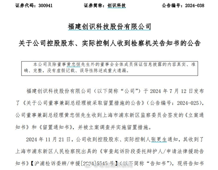 之前的2024年11月22日,创识科技(300941)(300941.SZ,股价21.95元,市值44.94亿元)公告称,11月21日,创识科技收到控股股东、实际控制人张更生通知,张更生收到了上海市浦东新区人民检察院出具的《审查起诉阶段委托辩护人/申请法律援助告知书》。