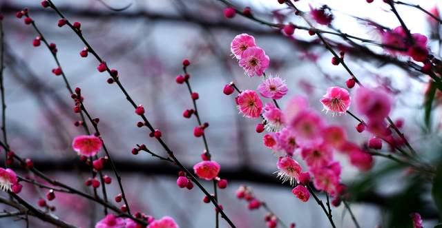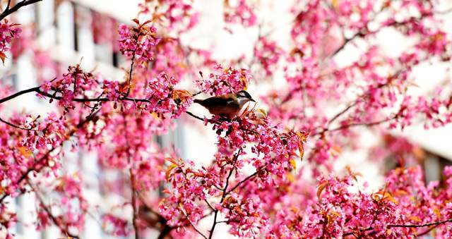 走近细观,那花的美更是摄人心魄。冬樱的花瓣薄而莹润,在逆光中能看清那纤细的脉络,果真像覆着一层初凝的冰晶,清透而脆弱。梅则另有一番风骨,枝条遒劲些,花朵也略小,但香气更加清冽幽远,丝丝缕缕,似有还无,需得静下心来,才能从流动的空气里捕捉到那一缕冷韵。花丛成了鸟儿与蜂蝶的小小乐园。不知名的雀儿在枝桠间灵巧地跳跃,啾啾的鸣声短促而欢快;几只不怕冷的蜜蜂,全然不顾这不是它们惯常忙碌的季节,依然执着地在花蕊间探寻,嗡嗡的振翅声,为这幅静美的图画,添上了一抹生动的、忙碌的底色。
