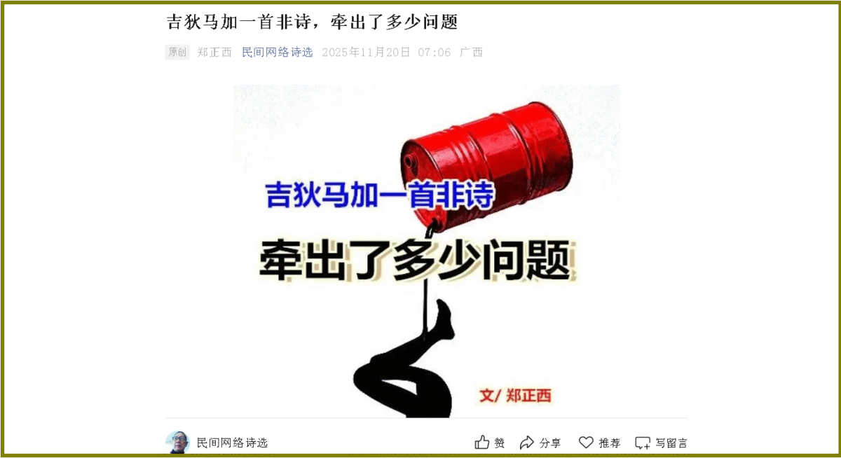 中国记录通讯社(记者 谢忠设)11月20日,郑正西在《郑正西网络诗选》上刊发了一篇《吉狄马加一首非诗,牵出了多少问题》,可谓是对时下诗歌现象的一记痛击。郑正西的正直,郑正西的唯质取稿的宗旨,让其经营的《郑正西网络诗选》被大众熟知和认可,被誉为诗坛的一股清流,诗坛的一片青天。一下为郑正西原创和刊发的《吉狄马加一首非诗,牵出了多少问题》文章: