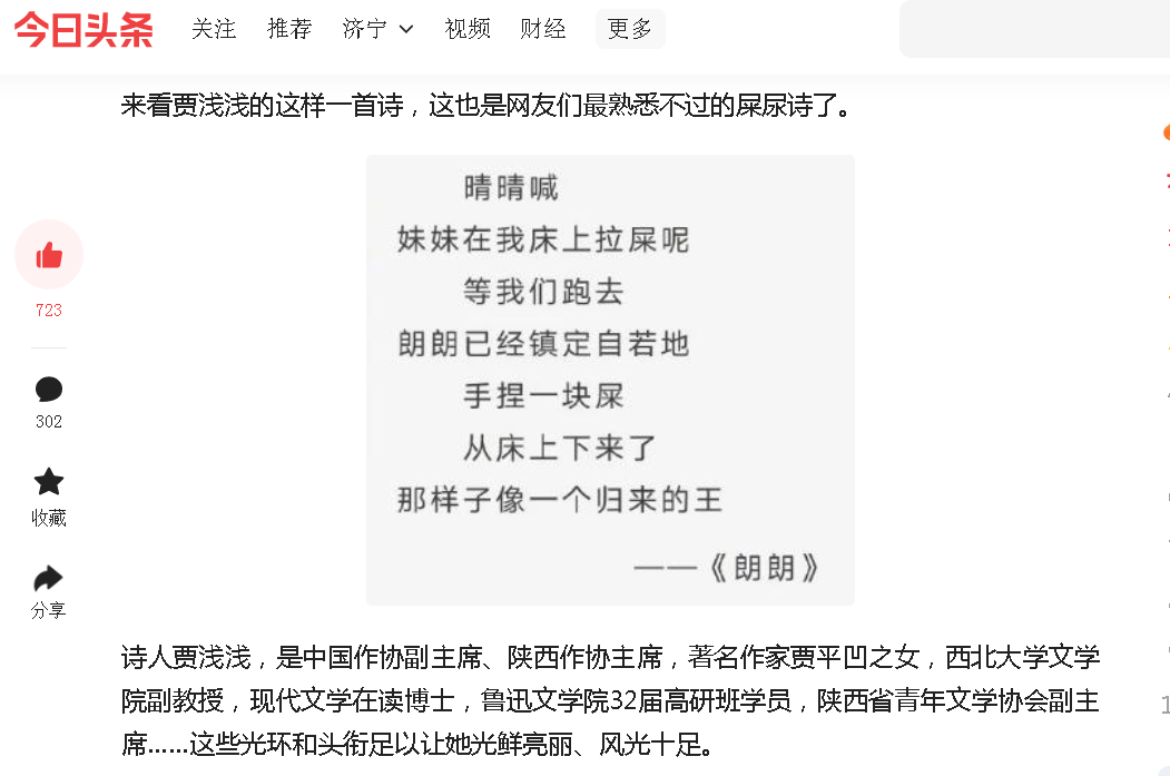 其实媒体曝光贾浅浅的下流诗歌的时候,贾浅浅写的作文里面就曾经曝光自己的父亲贾平凹收礼的故事,还说自己的父亲贾平凹书法10万一平尺。