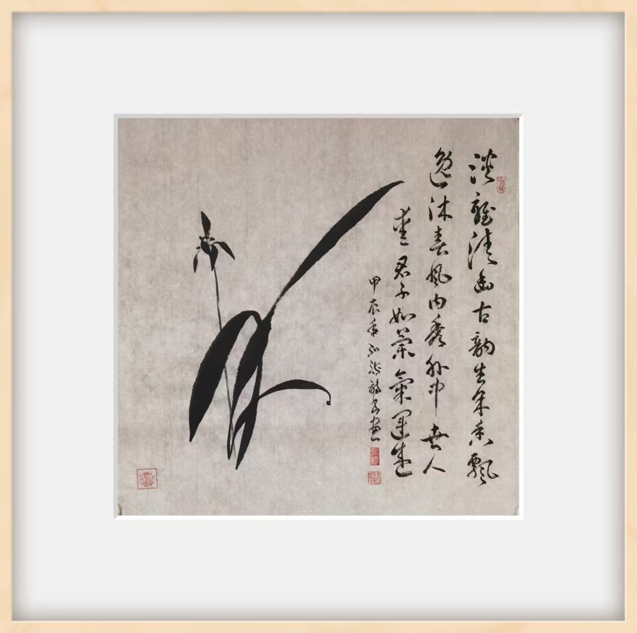 此三笔是:第一笔定势,悬腕如太极起势,凝成天地之轴,墨色徐行,在虚实相生间定下兰的魂魄。第二笔成局,舒展若凤目微启,长叶如剑,阴阳二气在提按顿挫中流转。第三笔破势,忽作惊鸿掠影,枯笔渗墨,黑色在疾徐转换间击碎平衡,万象皆活。随着这三笔,生长出晨露未晞、危崖怒放的幽兰。弘流的创新在于:将残碑断碣的斑驳肌理化为兰叶的天然纹路,让“屋漏痕”的涩滞笔意转为草木抽芽的生态韵律。三笔看似程式,实则暗藏草木生长的精妙——兰叶卷曲处是月华初升的弧度,枯笔飞白间藏着季风穿行的轨迹,方寸里,既是墨色对草木的生长,也是草木对光阴的反刍。正如弘流所作题画诗所吟: