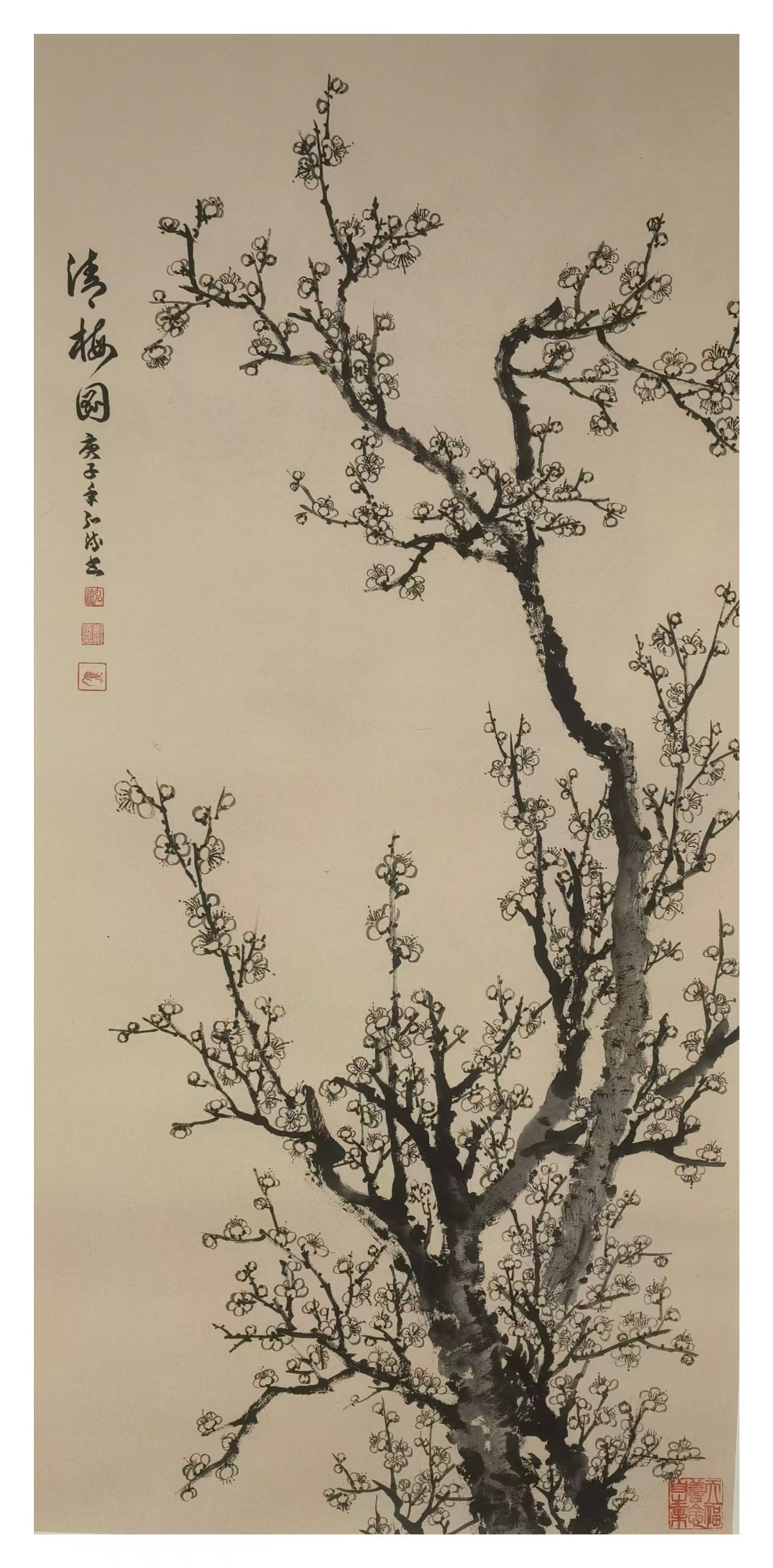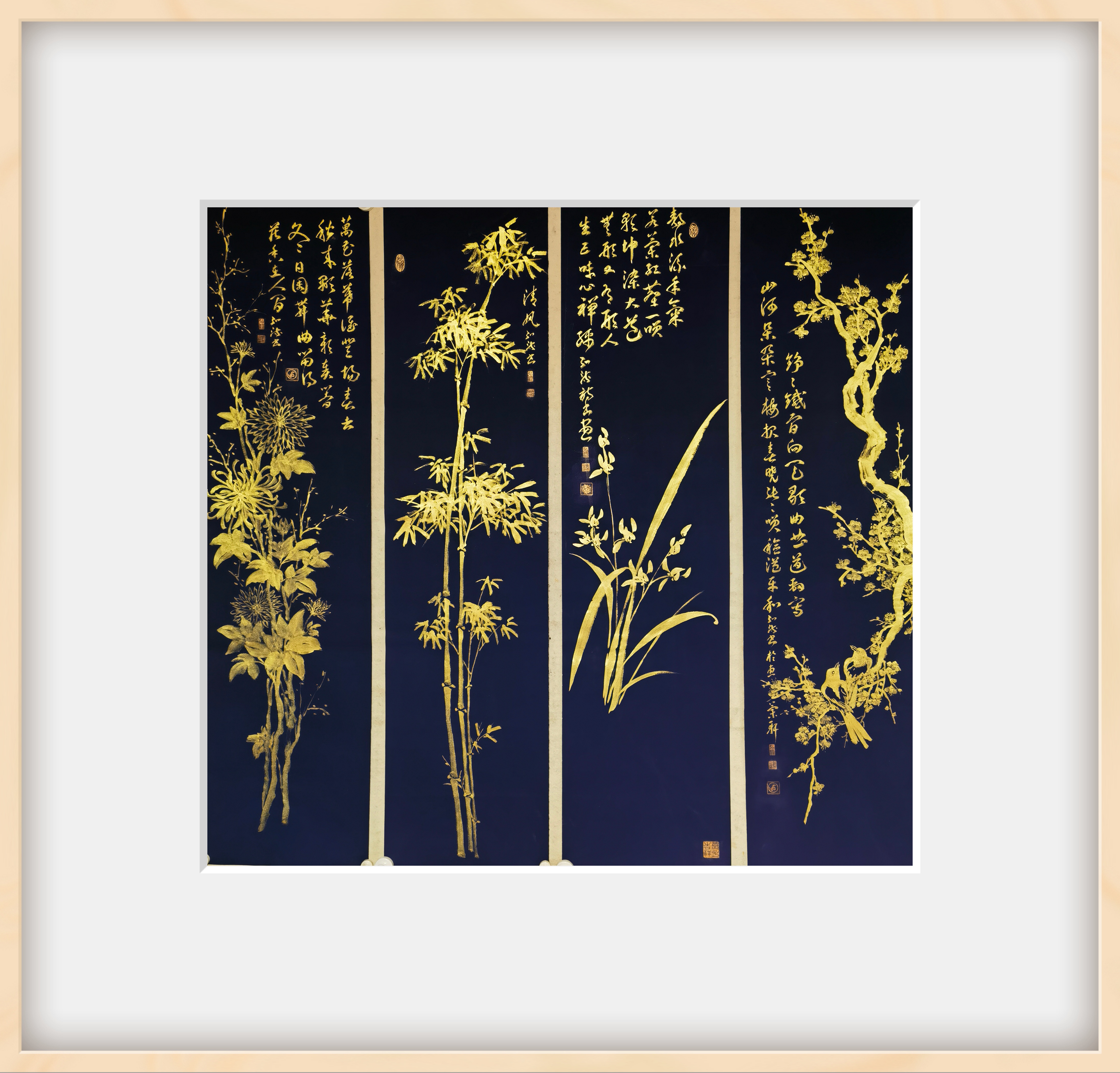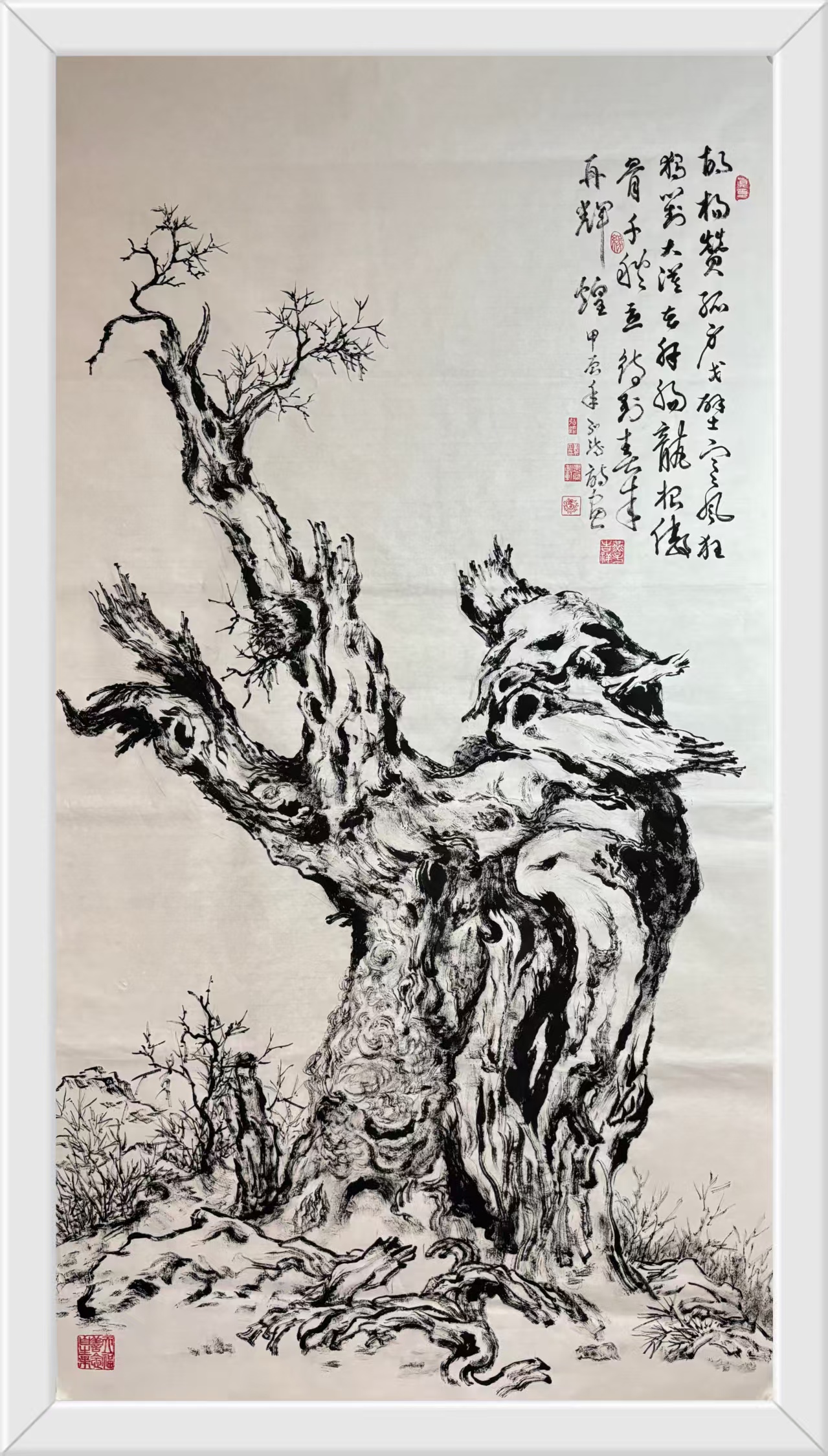 通过取法“千毫皴”技法的力道,兼融篆刻的刀锋艺术,加之持续临习王羲之、欧阳询、张旭等大家的书法,弘流从方正中偷来笔意,于狂草中截取气韵,使绘画与书法笔意相通,逐渐将金石的触笔气韵融入画魂,巧妙运用留白和墨色对比,创作出独具个人特点的“梅兰竹菊”四君子与沙漠胡杨绘画风格,终使得梅枝如铁铸,兰叶似刀裁,胡杨枝干在焦墨皴擦中发出金石铮鸣,方寸间自成苍茫宇宙。