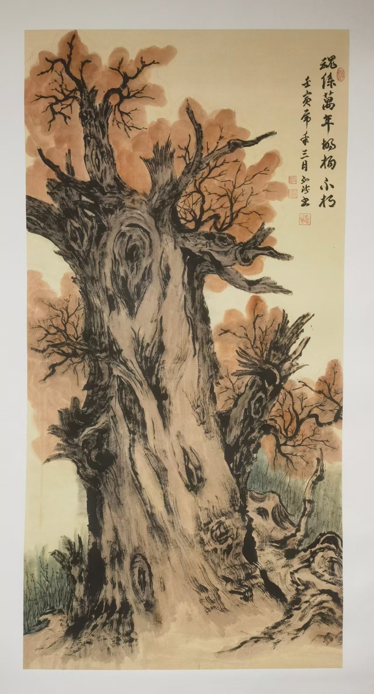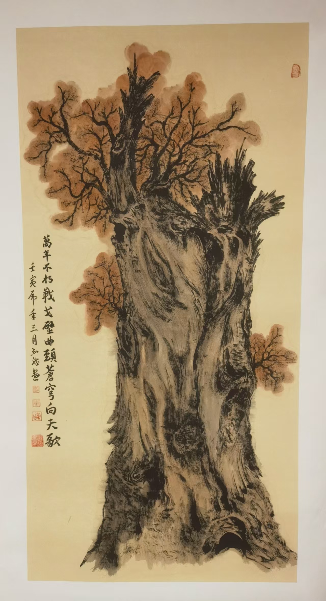 正是源于对胡杨林的深沉挚爱, 2018年至2021年间,弘流三赴西北大漠,在沙丘间丈量胡杨的年轮,看其根系在盐碱地编织密网,听风过枯枝时发出金属般的颤响——那是时光刻进骨髓的倔强。激荡心绪中,她为胡杨礼赞: