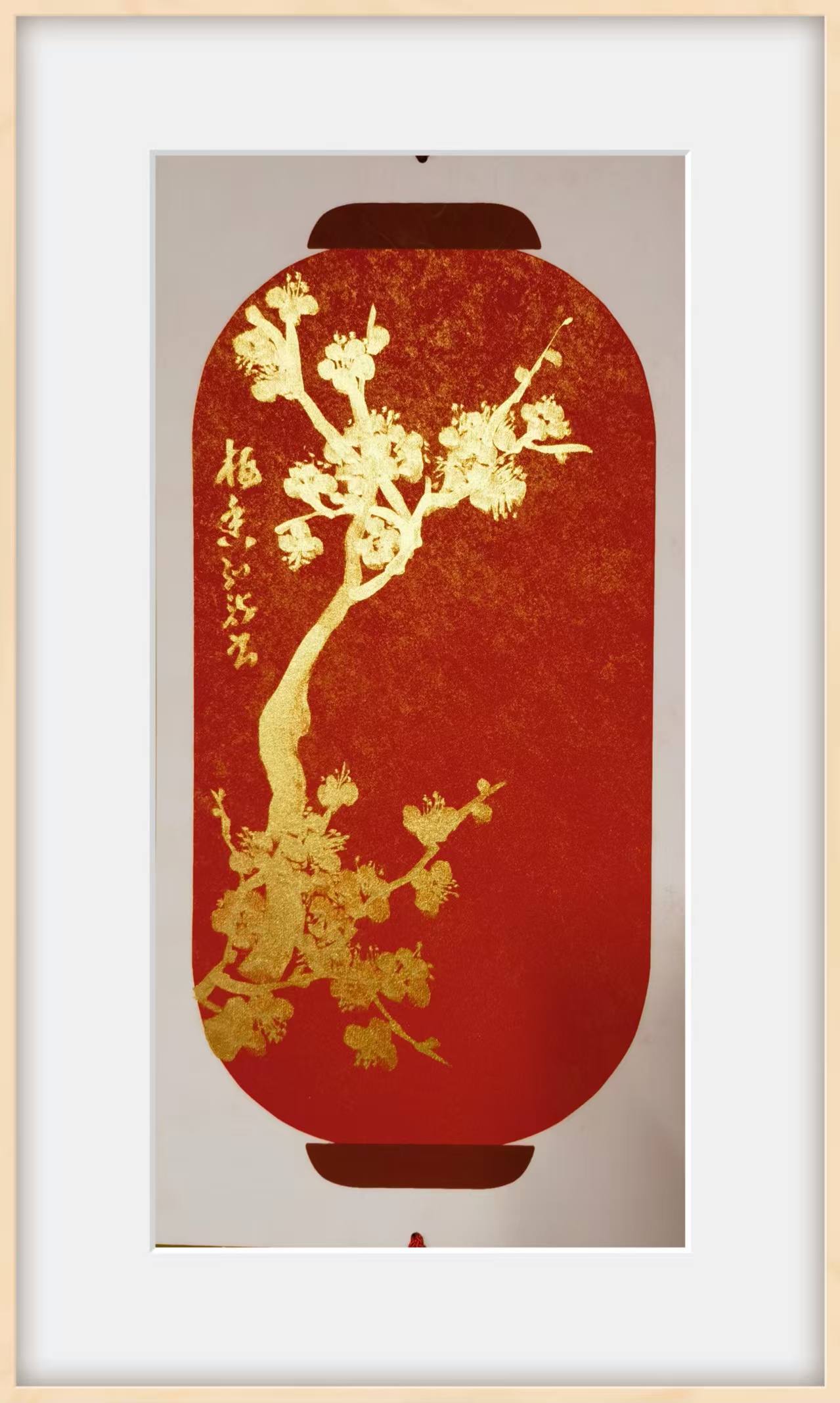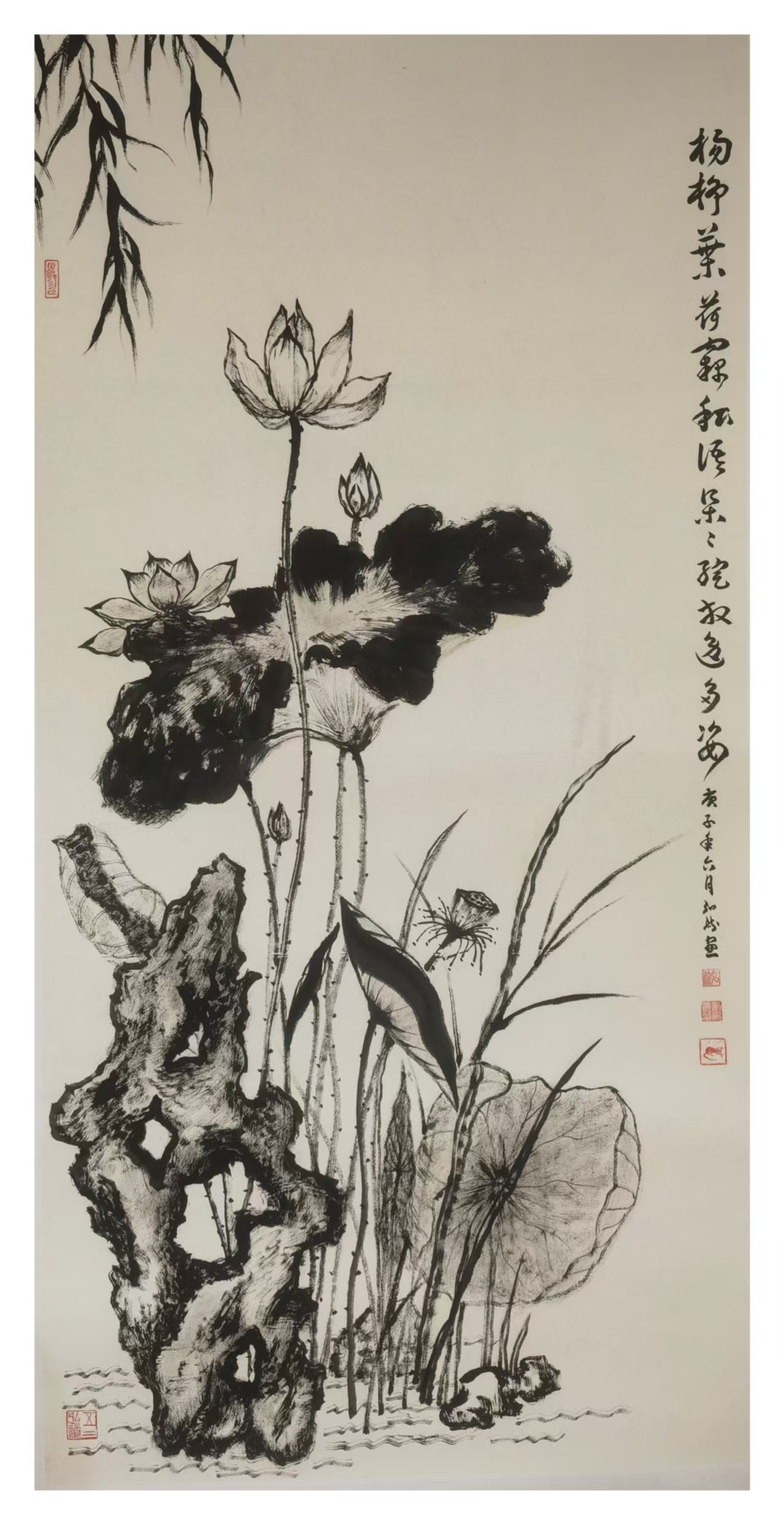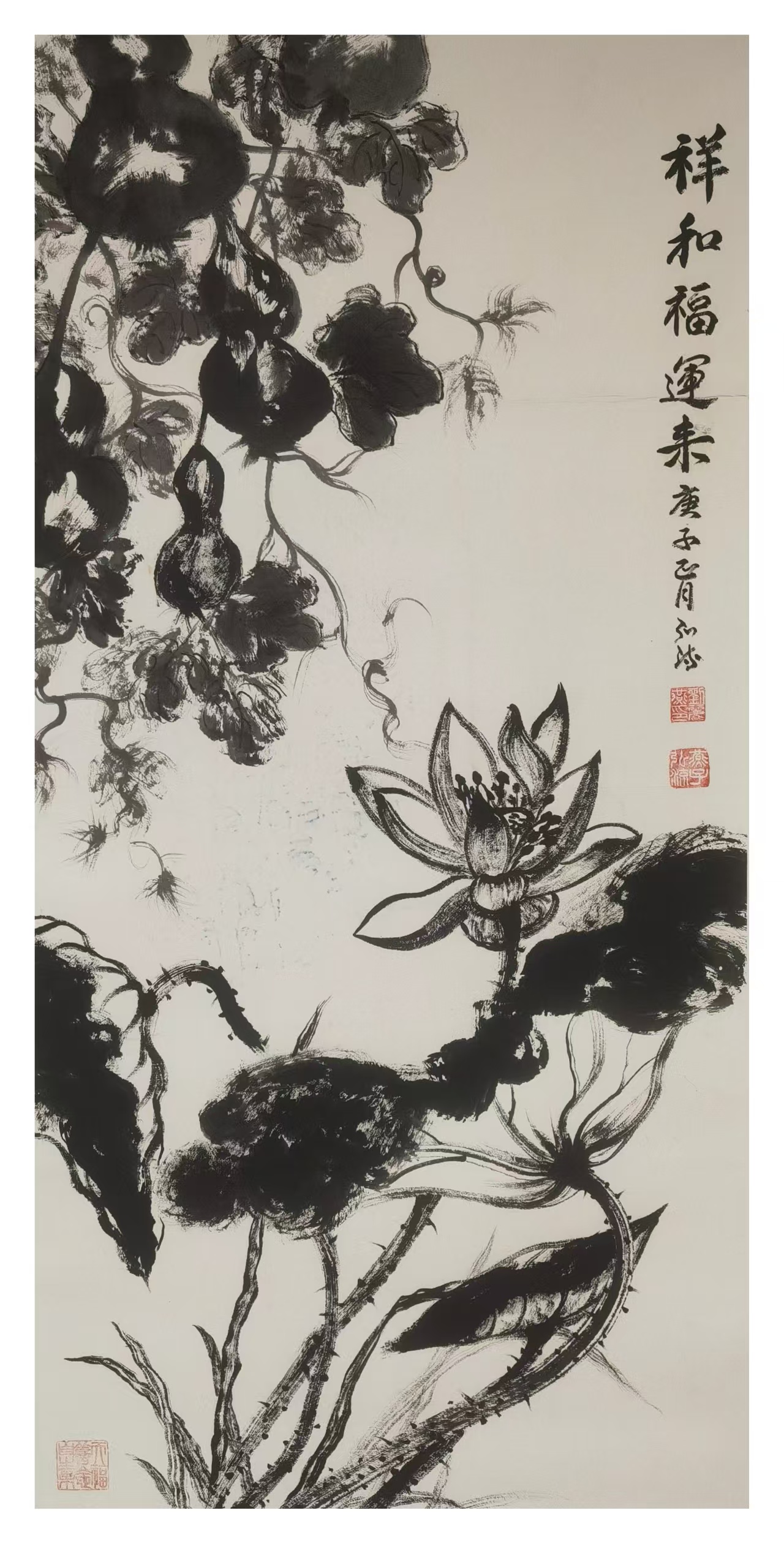 《中国红》系列花鸟画的创作过程充满挑战。单一色彩的限制恰是美学的炼金场。如何让这抹纯粹的红既流淌吉祥意蕴,又兼具花鸟的风骨神韵?创作者须得先在心中栽种下万千繁花:是牡丹盛放时的雍容张力,是梅花虬枝间的疏朗气节,也是莲花含苞时的清润禅意。待意象在胸臆间生长成熟,笔尖游走时便自有气韵流转。弘流以浓墨皴擦勾勒枝干筋骨,用淡彩晕染点染花瓣肌理,让红色在干湿浓淡中衍生出万千层次。这不是对色彩的妥协,而是让单一色调在笔墨的魔法中裂变,于留白处生出想象,于重彩处沉淀深情,让每一朵盛开的“中国红”终成为意与象的和弦。