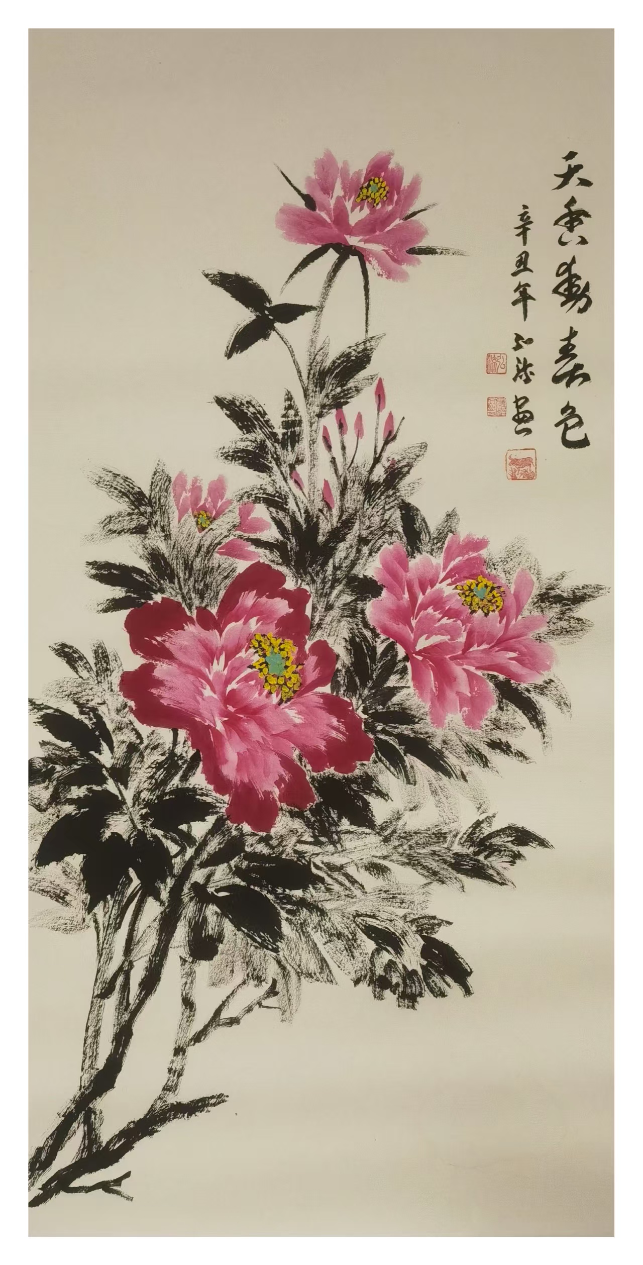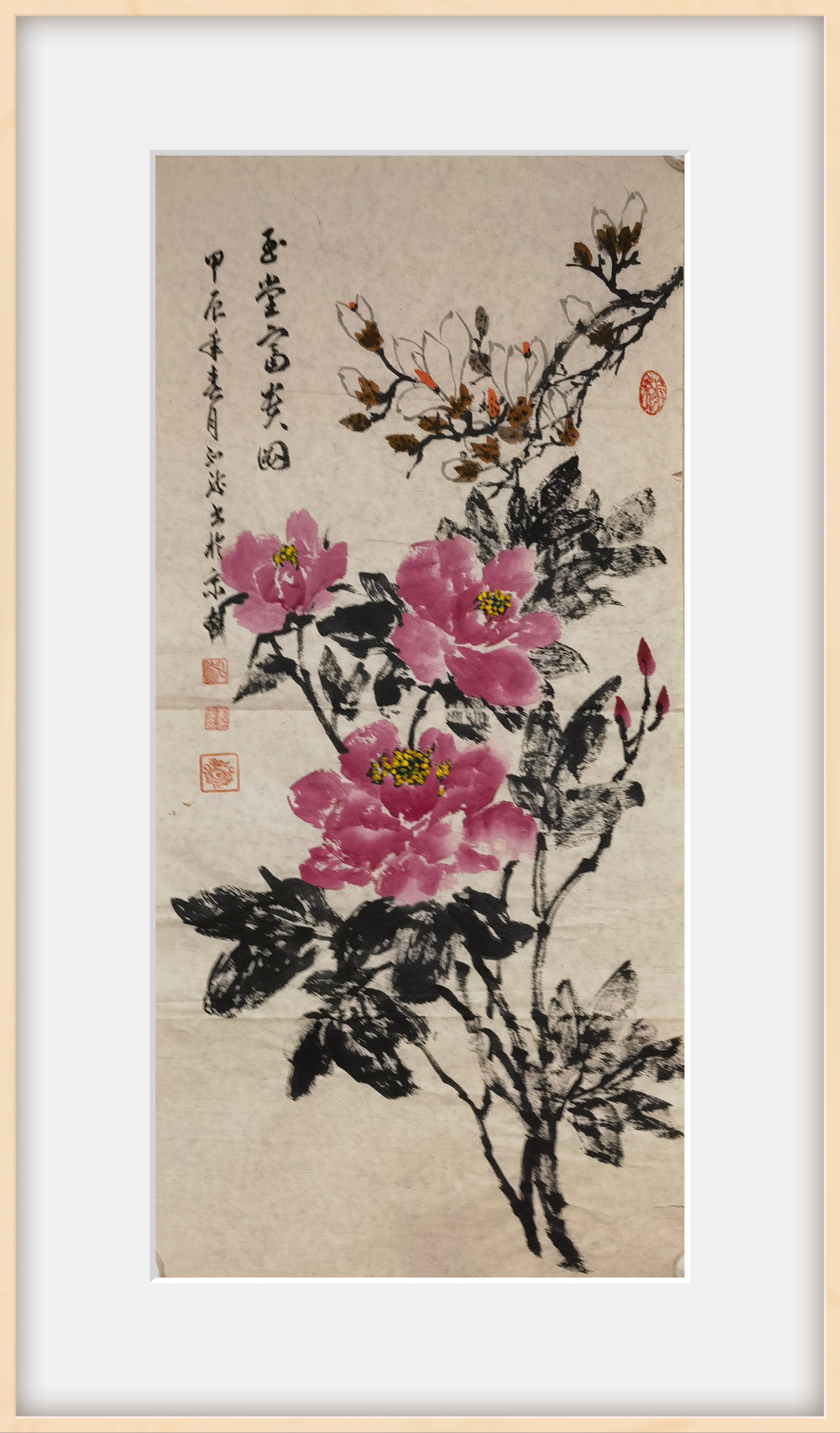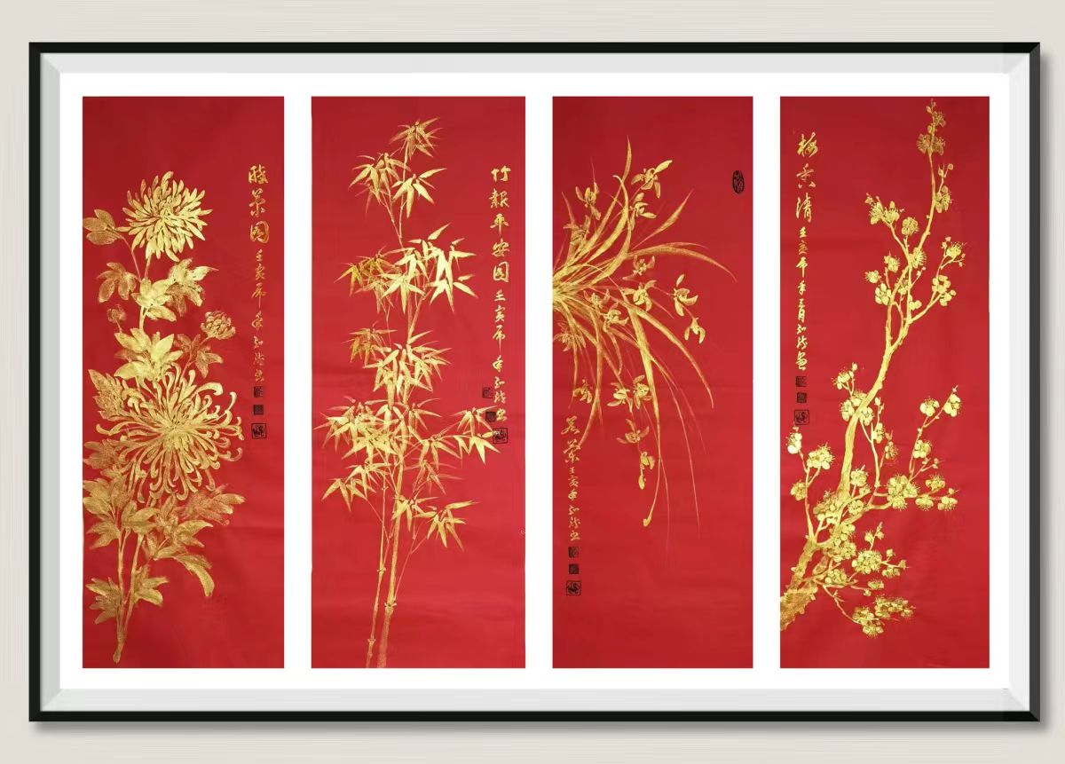 这份与花共生的创作力是山野的馈赠,早已刻入弘流的血脉基因。少年时追逐山花的足迹,已化作“灼灼其华”的意象根植心底。及至戎马天山,银白雪山与苍青岩壁交织的荒寒里,风削经幡,让弘流对砾石缝中倔强挣出的野罂粟红更为喜爱,对色彩理解更为深刻。初为人母,教女识花辨草时,蛰伏血脉的多年花种若春雪初融,找到了奔流之处。而缠绵病榻时,疼痛是命运的冰凿,凿开了弘流以花观生的灵与悟。水仙在窗台刻下的年轮,樱花凋落旋舞的轨迹,花开花落中,她读懂了其间藏着最本真的生命密码。这份天赐的偏爱,唯有执起画笔才能回应。题画诗《中国红》即是对生命的致敬,也是自我的映照。