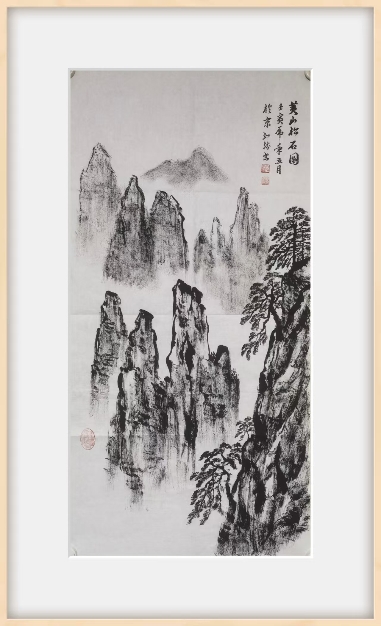 早在远古时代,焦墨之美便已悄然萌生。新石器时代的陶器上,流畅的墨线是远古先民的呓语,蜿蜒洇染八千春秋;汉画像石里,那朴拙刀笔刻录下“以线为骨”的华夏初代审美密码;明代徐渭醉酒泼画的葡萄藤,是枯笔在宣纸上卷起的墨色狂舞;清代八大山人凝墨启韵,孤鸟驮着寂寥山河,满纸苍凉。至近代,黄宾虹以“干裂秋风,润含春雨”的焦墨理论,破开黑白世界的混沌;张仃则以焦墨重绘山水魂魄,让黑白二色在时光长河里始终奔涌着滚烫的骨血。